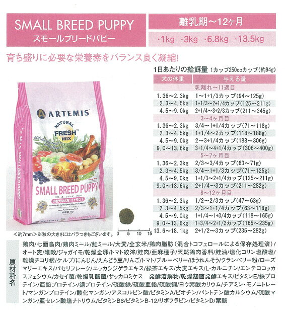 小型犬の離乳期?12ヶ月以下用ARTEMIS スモールブリードパピー 3kg 価格: 4,230円 レビュー評価: 0.0 レビュー数:0 内容量3kg保存方法直射日光・高温多湿を避けて保存してください。原材料鶏肉、七面鳥肉、鶏肉ミール、鮭ミール、大麦、全玄米、鶏肉脂肪(混合トコフェロールによる保存処理済)、オート麦、雑穀、ジャガイモ、乾燥全卵、トマト絞滓、鮭肉、亜麻種子、天然鶏肉香料、鮭油、塩化コリン塩酸塩、乾燥チコリ根、ケルプ、にんじん、えんどう豆、りんご、トマト、ブルーベリー、ほうれんそう、クランベリー粉、ローズマリーエキス、パセリフレーク、ユッカシジゲラエキス、緑茶エキス、大麦エキス、L-カルニチン、エンテロコッカスフェシウム、カセイ菌、乾燥乳酸菌、サッカロミケス 発酵溶解物、乾燥麹菌発酵エキス、ビタミンE、鉄プロテイン、 Supported by 楽天ウェブサービス |